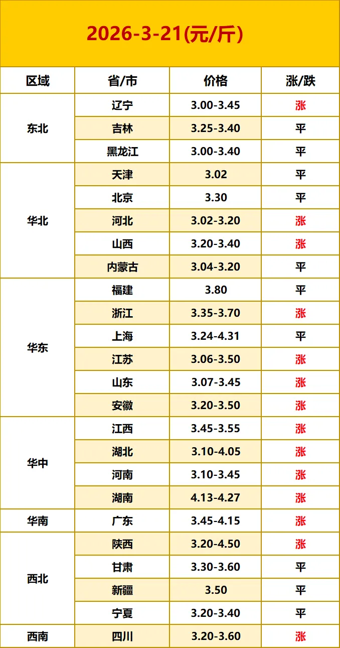 【鸡蛋价格】2026.3.21—最新鸡蛋价格 养羊网 2026-03-21 【鸡蛋价格】2026.3.21—最新鸡蛋价格点击蓝字关注我们吧~ 已关注 关注 重播 分享 赞 视频详情 价格仅供参考 已关注 关注 重播 分享 赞 视频详情 养羊网 2026-03-21 上一篇:【明天猪价】2026.3.21日全国猪价(已更新!) 下一篇:【超前猪价】3月22日~3月24日!全国猪价大预测! 您可能还会对下面的文章感兴趣111: 相关文章 4月9日猪肉价格 【猪价早报】2026.1.4全国猪价猪价有变 2026年2月4日 鸡蛋价格, 最新蛋价行情! 农村粮食喂养黑猪