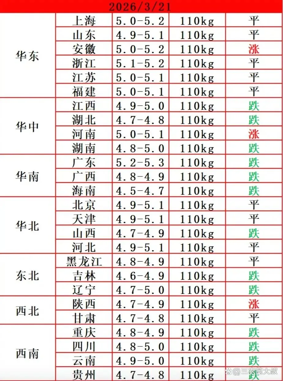 猪价一夜跌更猛 附2026年3月21日全国各地最新猪价行情 养羊网 2026-03-21 猪价一夜跌更猛 附2026年3月21日全国各地最新猪价行情关注猪业招募微信公众号广交五湖四海朋友,方便家人同行招聘求职万千资源,各取所需,非诚勿扰!感恩感谢对本平台的信任与支持!商务合作请添加微信详谈:Zhuyetj今日全国生猪平均价格为9.83元/公斤 养羊网 2026-03-21 上一篇:【猪价预测】2026年3月23日~3月25日!全国猪价! 下一篇:2026.3.21 猪价 您可能还会对下面的文章感兴趣111: 相关文章 狗狗币狂飙在即,突破阻力位冲击0.5美元! 鸡蛋30个价格跌破2位数下探至9.9 近期价格更新!!! 才35.9??这个可生食蛋 价你确定不心动吗