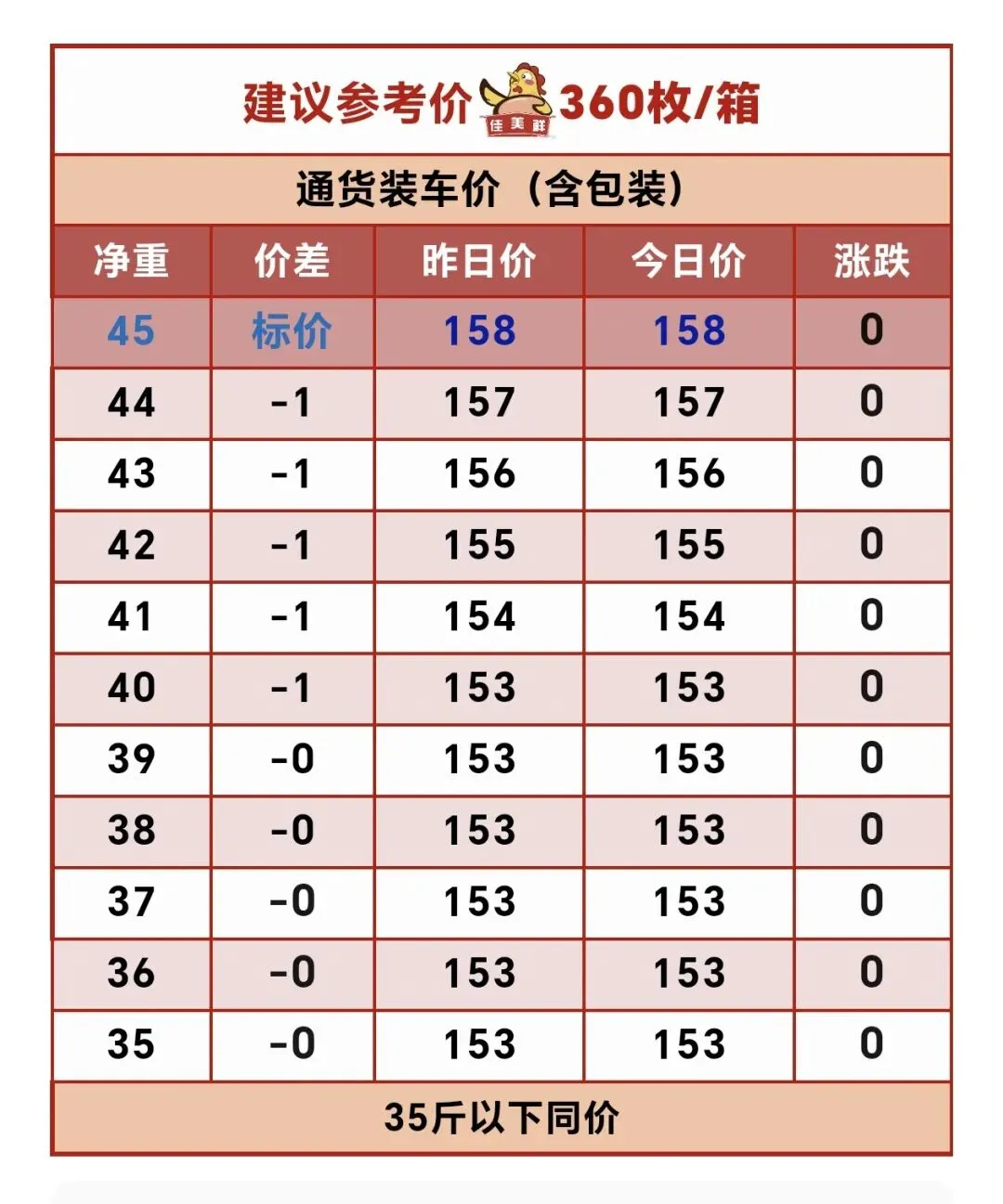 8.?湖北浠水粉蛋价格涨3,45斤粉蛋含箱蛋点收购161元每箱,45-43斤,轻1斤减2元每箱,42斤155元涨3,42-38斤,轻1斤减2元每箱,38-33轻1斤,减3元每箱,360枚纸箱装。