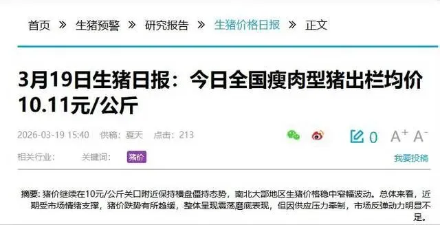 2026年3月,全国生猪出栏均价跌破10.11元/公斤,折合下来不到5元一斤,新疆部分地区甚至跌到9.3元/公斤,养猪户彻底陷入亏本困境。一头120公斤的猪卖出去才1194元,可养下来成本最少1400元,卖一头亏两三百,这账算下来谁看谁心疼。