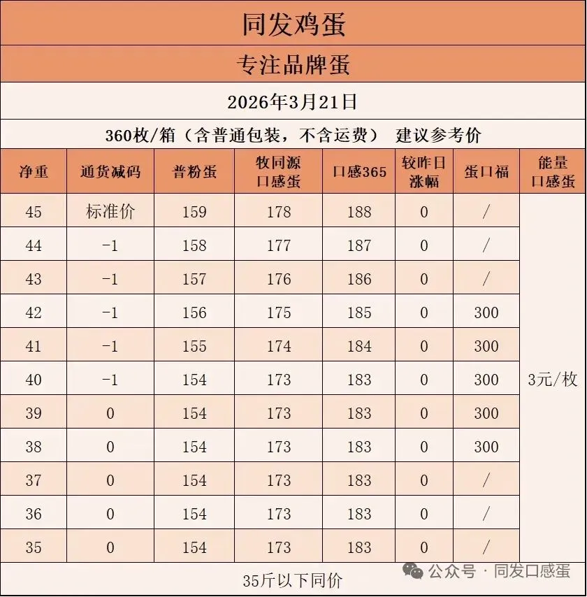2026年3月21日贵港同发鸡蛋价格 养羊网 2026-03-21 2026年3月21日贵港同发鸡蛋价格以上价格为贵港同发鸡蛋平台公示的鸡蛋含包装成交结算价(上车价),仅供本平台渠道对接合作伙伴参考使用,不与其他任何报价做比较。 养羊网 2026-03-21 上一篇:2026年3月21日《葫芦蛋》鸡蛋价格 下一篇:大洋路鸡蛋价格2026年 3 月 21 日报价 您可能还会对下面的文章感兴趣111: 相关文章 我的十一角色——放羊娃 近期价格更新!!! 近期价格更新!!! 近期价格更新!!!