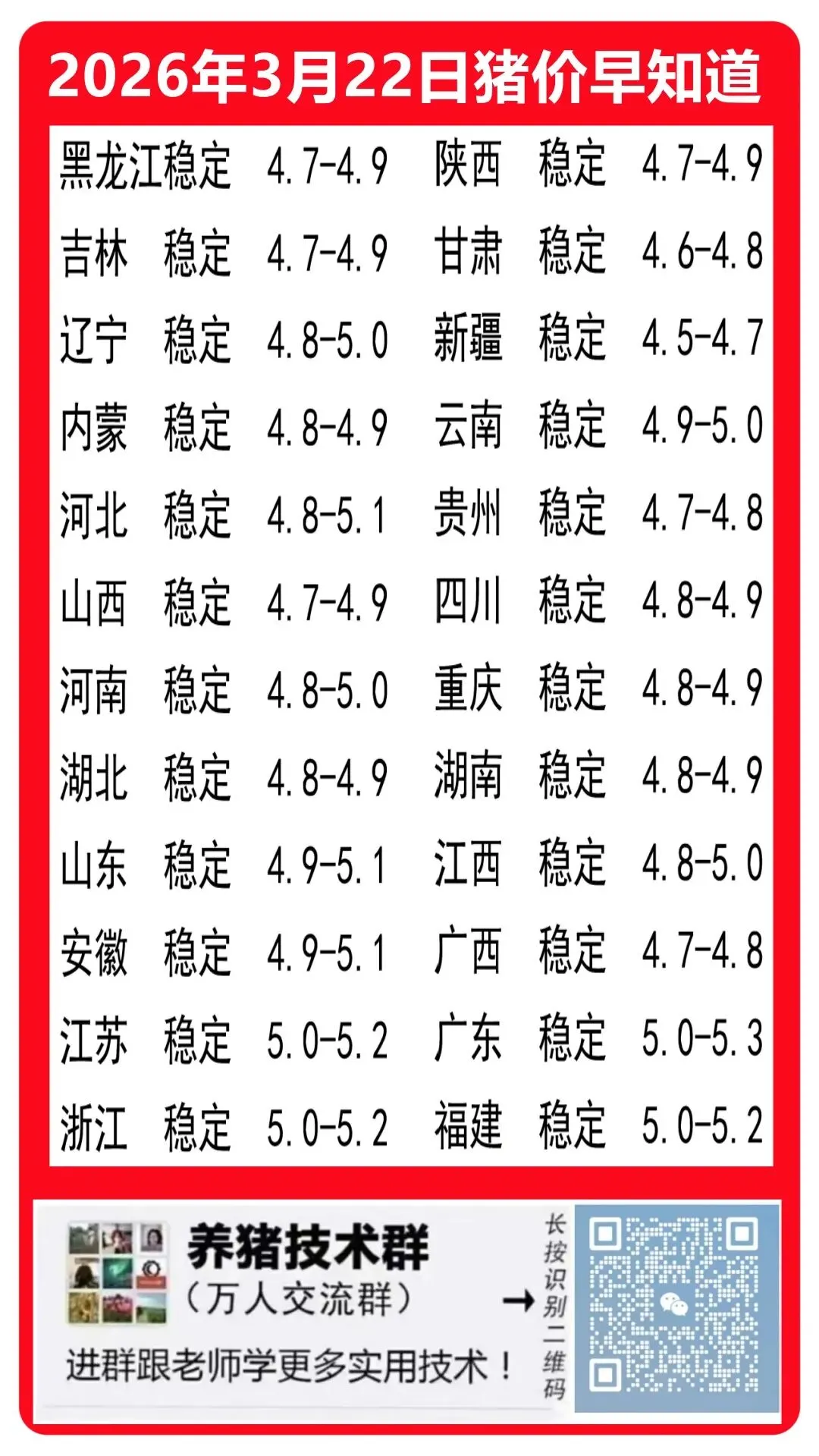 猪价回稳!!2026年3月22日全国猪价回稳!! 养羊网 2026-03-21 猪价回稳!!2026年3月22日全国猪价回稳!! 养羊网 2026-03-21 上一篇:猪价创近15年新低!头部猪企也扛不住了?短时猪价走势仍有压力 下一篇:影响鸡蛋价格波动的因素有哪些? 您可能还会对下面的文章感兴趣111: 相关文章 近期价格更新!!! 黑毛猪腿肉20元一斤了 固原美食--羊羔肉 猪价调整!2026年1月30日全国各地最新猪价行情!
