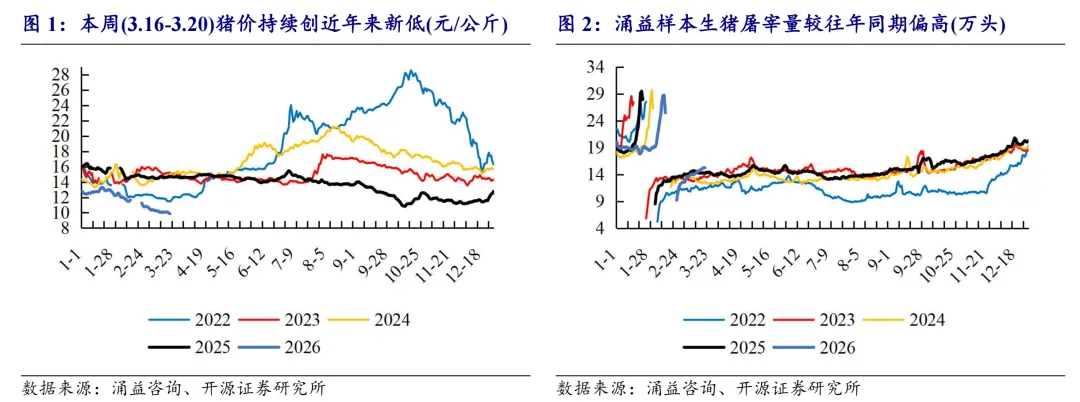 猪价持续创新低拐点未现,二育谨慎与被动入库强化弱势。据涌益咨询,截至2026年3月20日,全国生猪均价跌至9.87元/kg,本周猪价延续单边下行态势并加速赶底。日度屠宰量维持较高位,较往年同期明显偏高。价格创新低与屠宰高放量并存,验证当前市场生猪供给十分充裕,前期积压产能正加速兑现。出栏体重分化严重,截至3月19日,全国出栏均重128.62kg,其中集团场出栏均重125.71 kg,同比-0.21kg,保持正常出栏节奏,散户出栏均重高达144.60 kg,同比+8.50kg。散户出栏体重显著高于去年同期,压制未来猪价反弹力度。肥标价差方面,截至3月19日,150kg肥猪与120kg标猪价差为0.72元/kg,较上周-0.04元/kg,大猪溢价边际趋弱,与出栏体重回补并行,结构性压力仍在。