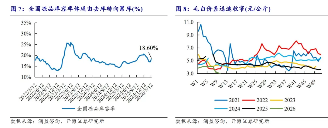 节后消费疲软白条走弱、毛白收敛,二育及屠宰端入场托底意愿较弱。需求方面,截至3月1 9日,全国冻品库容率为18.60%,环比+0.73pct,呈现小幅被动入库态势。3月19日白条价格跌至13.02元/kg,环比-0.26元/公斤,且毛白价差持续收缩至2.96元/kg。白条回落幅度大于猪价,节后终端消费疲软。二育方面,截至3月10日二育栏舍利用率小幅回升至28.9%,整体依然处于较低位水平,二育群体对当前极端低价抄底行为保持谨慎。