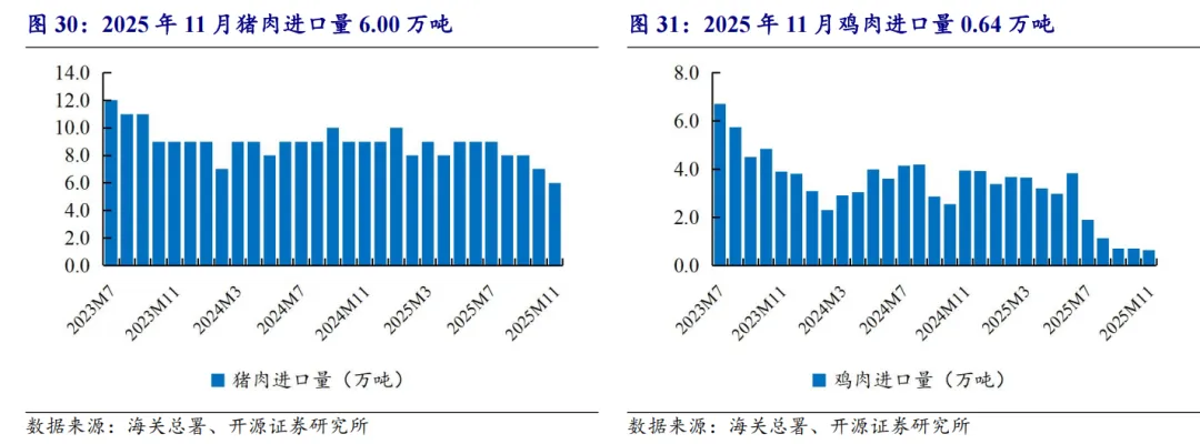猪肉进口:据海关总署数据,2025年11月猪肉进口6.00万吨,同比-34.3%。