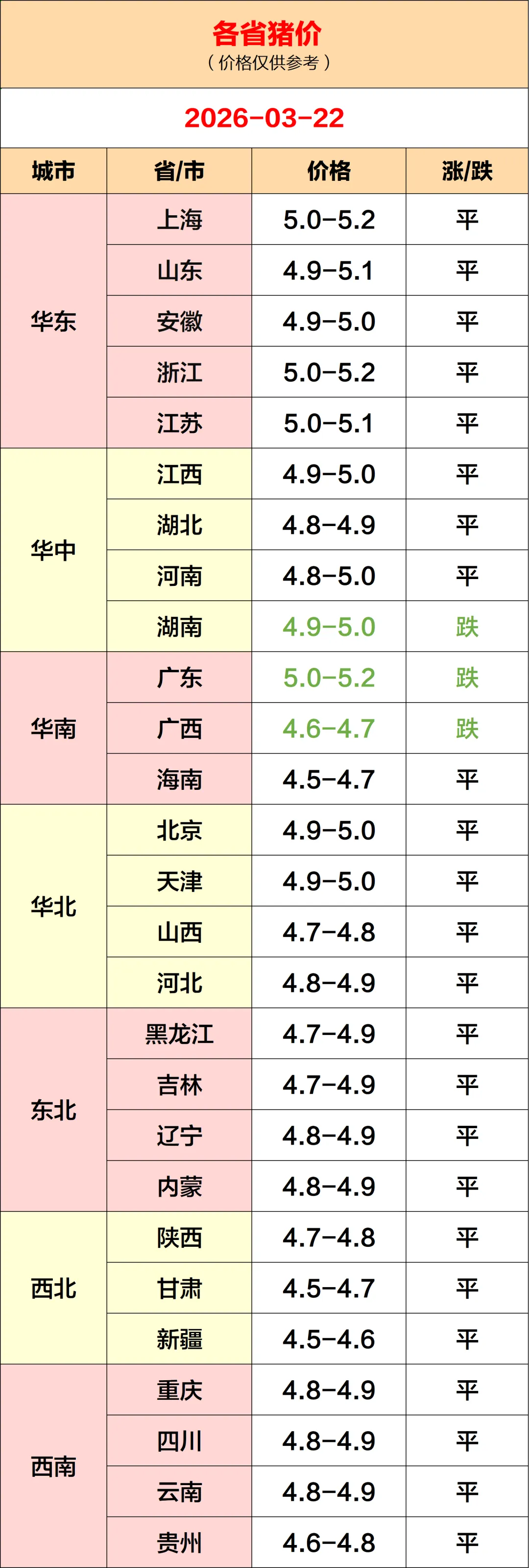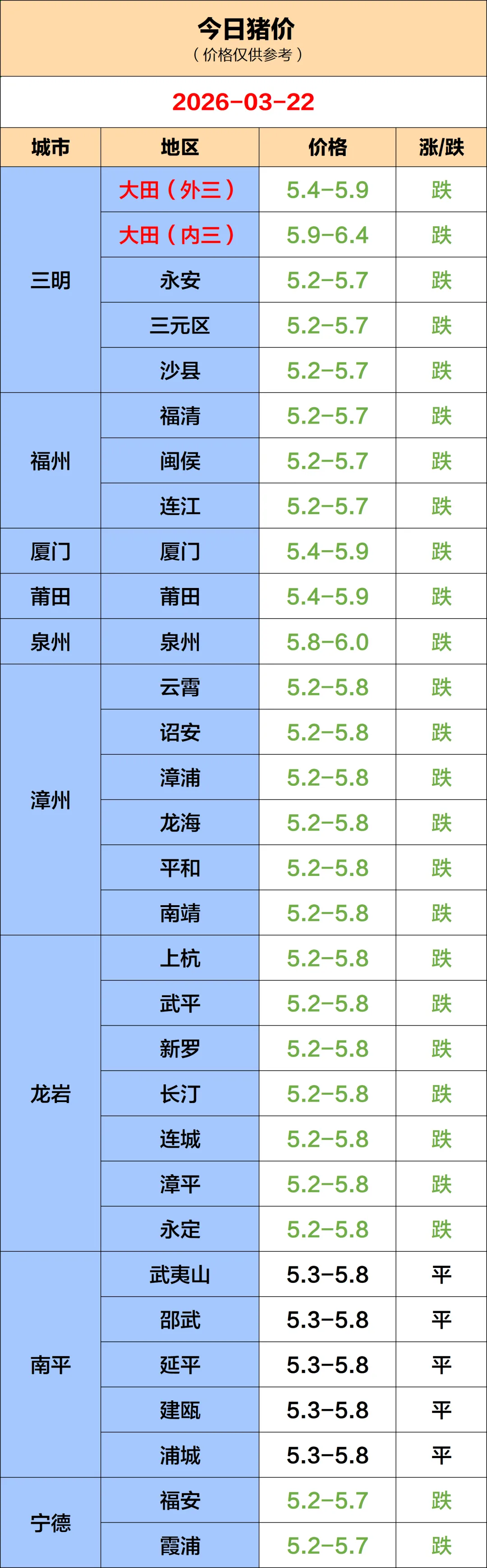 温馨提示:各场因猪的品种、品质、大小、单批销售数量等因素不同,实际售价均可能有所差异,以上报价仅供参考。(以上数据参考来源:福建鸣洋)
