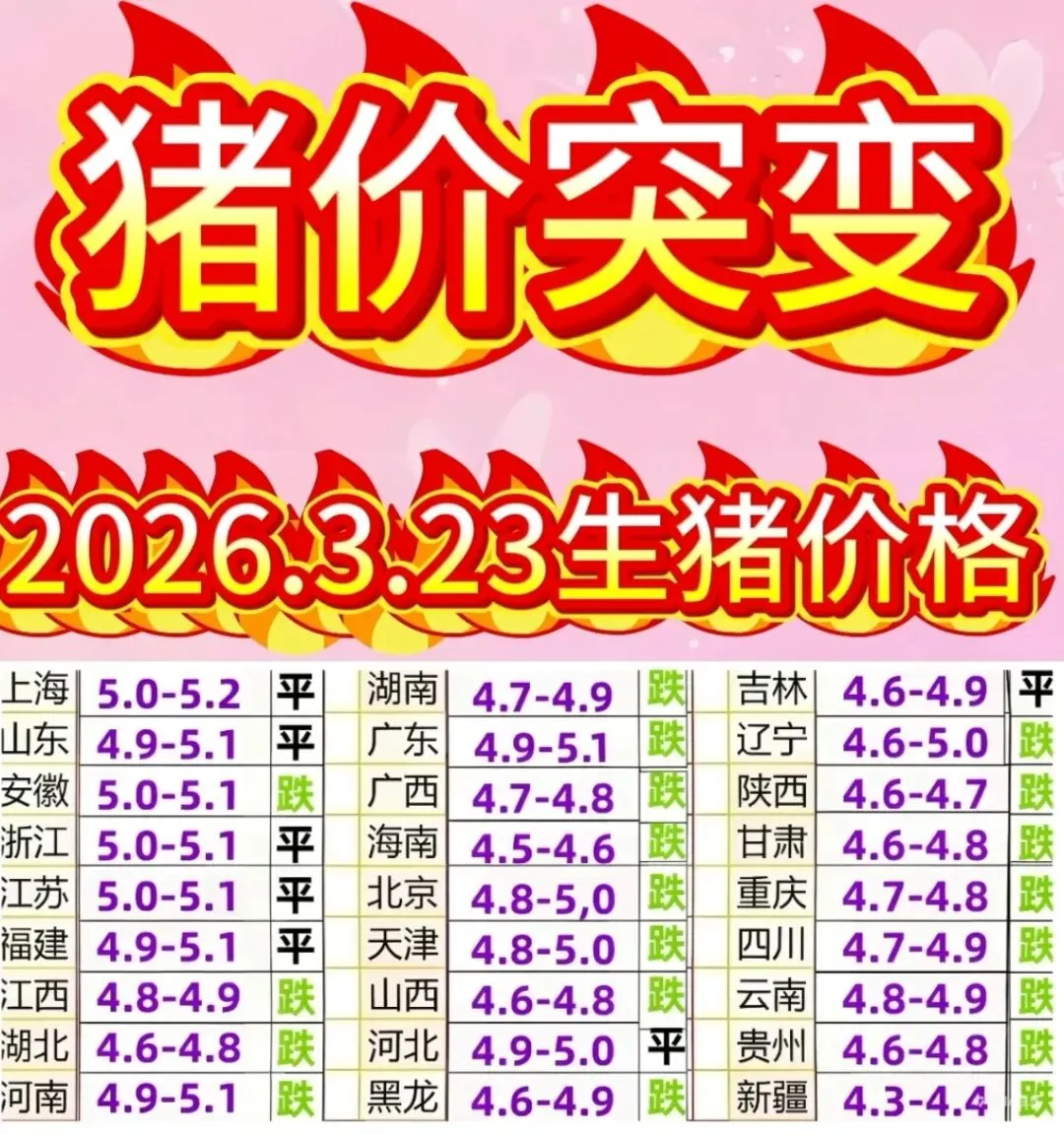 猪价突变!2026年3月23日生猪价格 养羊网 2026-03-22 猪价突变!2026年3月23日生猪价格 养羊网 2026-03-22 上一篇:【明天猪价】2026.3.23全国猪价 (已更新!) 下一篇:今日猪价 | 2026.3.23明天猪价走势信息! 您可能还会对下面的文章感兴趣111: 相关文章 全国猪价稳定!!2026年1月9日全国猪价稳定为主! 2025年4月13日全国各地生猪价格信息 【明日猪价】2月21日全国最新猪价(已更新) 2025年4月13日全国各地生猪价格信息
