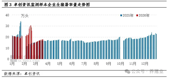 3月份供应在增加,需求却减少。2026年春节在2月中下旬,3月份处于年内生猪需求“冰点”,家庭库存未消化完毕,终端市场走货不畅,屠宰企业订单有限、采购不积极,需求端对猪价产生利空影响。截至20日,卓创资讯监测3月份样本企业生猪日度屠宰量为16.71万头,环比减少24.49%。月内需求虽有恢复,但速度缓慢,对猪价的支撑作用有限。