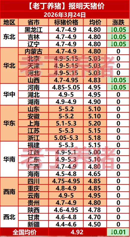 猪价还涨吗?【明天猪价】3月24日全国猪价涨跌表!关注老丁养猪