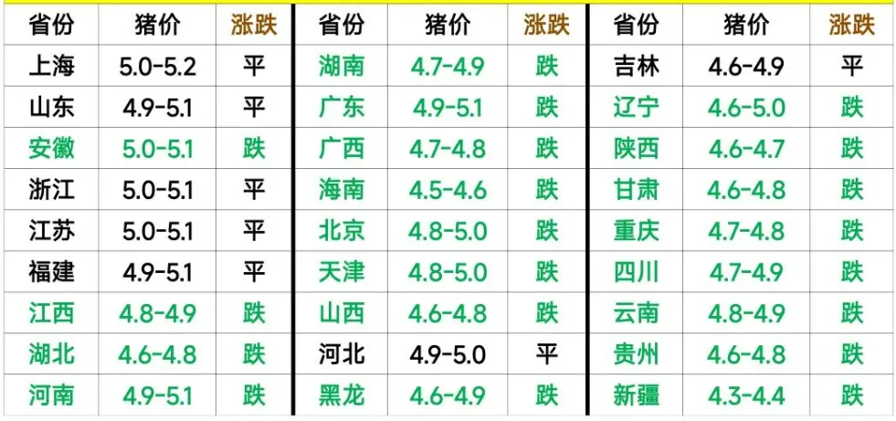 河南4.9-5.1跌,山东4.9-5.1平,河北4.9-5.0平。这几个养猪大省,基本都在5块上下挣扎。