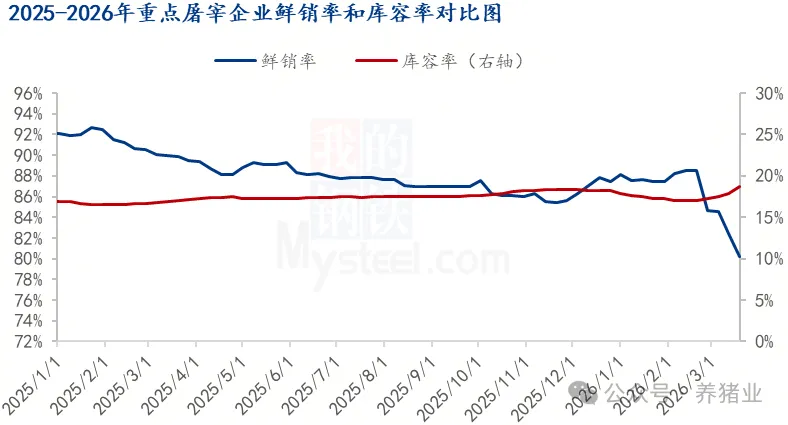 据Mysteel数据,截至2026年第12周,屠宰企业冻品库容率较前一周增加0.88个百分点,同比上升1.70个百分点,但这一现象背后是终端消费承接能力不足的体现。鲜销率下滑导致部分白条产品无法及时消化,被动转入冷库,形成“被动累库”。当前冻品库存的积累并非源于企业主动看好后市,而是市场销售不畅导致。