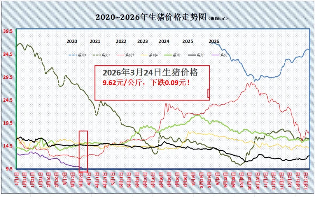 跌猛了,猪价下跌“无休止”!附:3月24日猪价时光荏苒,3月渐入下旬,2026年一季度即将收官。在国内生猪方面,今年以来,猪价呈现“先扬后抑”的走势。基于2025年末养殖端出栏节奏前移,冬至前后多元主体标猪以及中大猪集中出栏,进入2026年初,短时间内,供应压力减轻,肥猪价格偏强,带动养殖户压栏增重,标猪报价逆势上涨,1月中上旬,外三元猪价涨至13.16元/公斤,猪价创下阶段性新高。 但是,进入1月下旬后,由于春节临近,年前出栏时间减少,养殖端出栏压力较大,规模以及社会面猪场持续增量出栏,春节前猪价以滑坡下跌为主。尤其是,春节过后,消费惯性回落,而养殖端出栏计划偏多,供需失衡态势凸显,国内猪价持续走低,截至目前,外三元标猪触底9.71元/公斤,猪价创下近6年以来新低。 目前,国内生猪市场,南北地区,猪价缺乏明显价差,南北主流地区,标猪报价降至9.35~10.35元/公斤左右,养殖亏损深跌增加,自繁自养头均亏损在280元左右! 从饲料成本来看,一季度,国内饲料原材料方面,玉米以及豆粕价格持续走高,尤其是,此前国际地缘局势紧张,外输性涨价压力增加,现货玉米重心上移,豆粕报价也持续走高,养殖成本大幅提升,从最新消息了解,近期,国内主流饲料价格上涨了80元/吨左右,这进一步加剧养殖亏损的压力! 从供应来看,受生猪产能处于集中释放阶段,前期母猪存栏处于高位,且,母猪效率提升,阶段性生猪供应趋势宽松!且,气温回升,生猪育肥增重加快,市场中小标猪供应增加,碍于市场对于肥猪需求不足,饲料成本攀升,养殖端压栏心态偏弱,减重增量出栏意愿偏强,集团猪企出栏集中,供应过剩的压力依然存在; 从需求来看,目前,猪肉购销缺乏利好,鲜品白条购销冷冻,屠宰场亏损增加至近20元/头,主流屠宰场心态谨慎!但是,由于市场标猪报价较低,受母猪存栏趋势变化,市场对于三季度猪价前景存在信心,部分屠宰场有主动分割入库现象!二次育肥也有逢低补栏标猪的操作,不过,由于市场信心一般,抄底支撑相对有限! 由此分析,受供需变化,预计,3月24日,外三元标猪报价在9.62元/公斤,下跌0.09元,市场维持磨底的走势,后市关注集团猪企出栏节奏的变化!