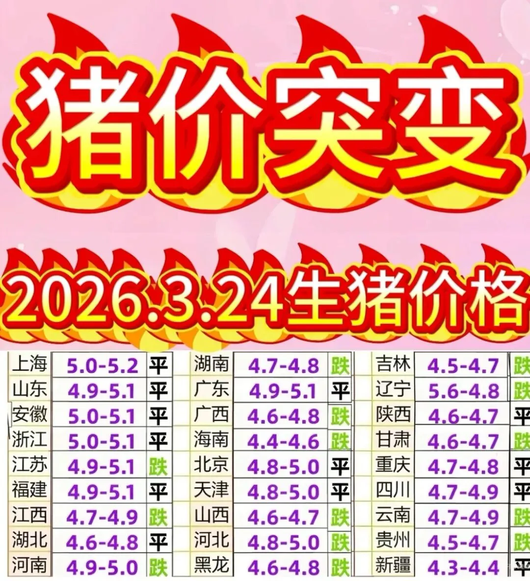 猪价突变!2026年3月24日生猪价格 养羊网 2026-03-23 猪价突变!2026年3月24日生猪价格 养羊网 2026-03-23 上一篇:一夜降温,猪价下跌“跌猛了”!附:3月24日猪价 下一篇:猪价平稳!!!26.3.24明日猪价,全国最新猪价信息!!! 您可能还会对下面的文章感兴趣111: 相关文章 近期价格更新!!! 【明天猪价】 2026 1. 11 全国猪价!! 猪价创新低,生猪 “反内卷” 政策加速落地 韩国鸡蛋价格20元左右