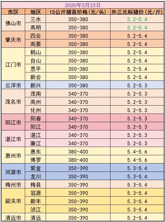 3月23日猪价速递 养羊网 2026-03-23 3月23日猪价速递广东猪苗报340~400元,毛猪报5.2~5.6元,除佛山微跌外,其它各地区价格稳定。(行情仅供参考) 养羊网 2026-03-23 上一篇:明日全国猪价(2026.3.24) 下一篇:【超前猪价大预测】3月25日~3月27日!生猪市场“寒冬”何时了?政策托底能否催生拐点? 您可能还会对下面的文章感兴趣111: 相关文章 2025年4月13日全国各地生猪价格信息 近期价格更新!!! 2025年4月13日全国各地生猪价格信息 猪价跌破5元/斤,为何仍难见反弹?『生猪新闻2026年03月05日』
