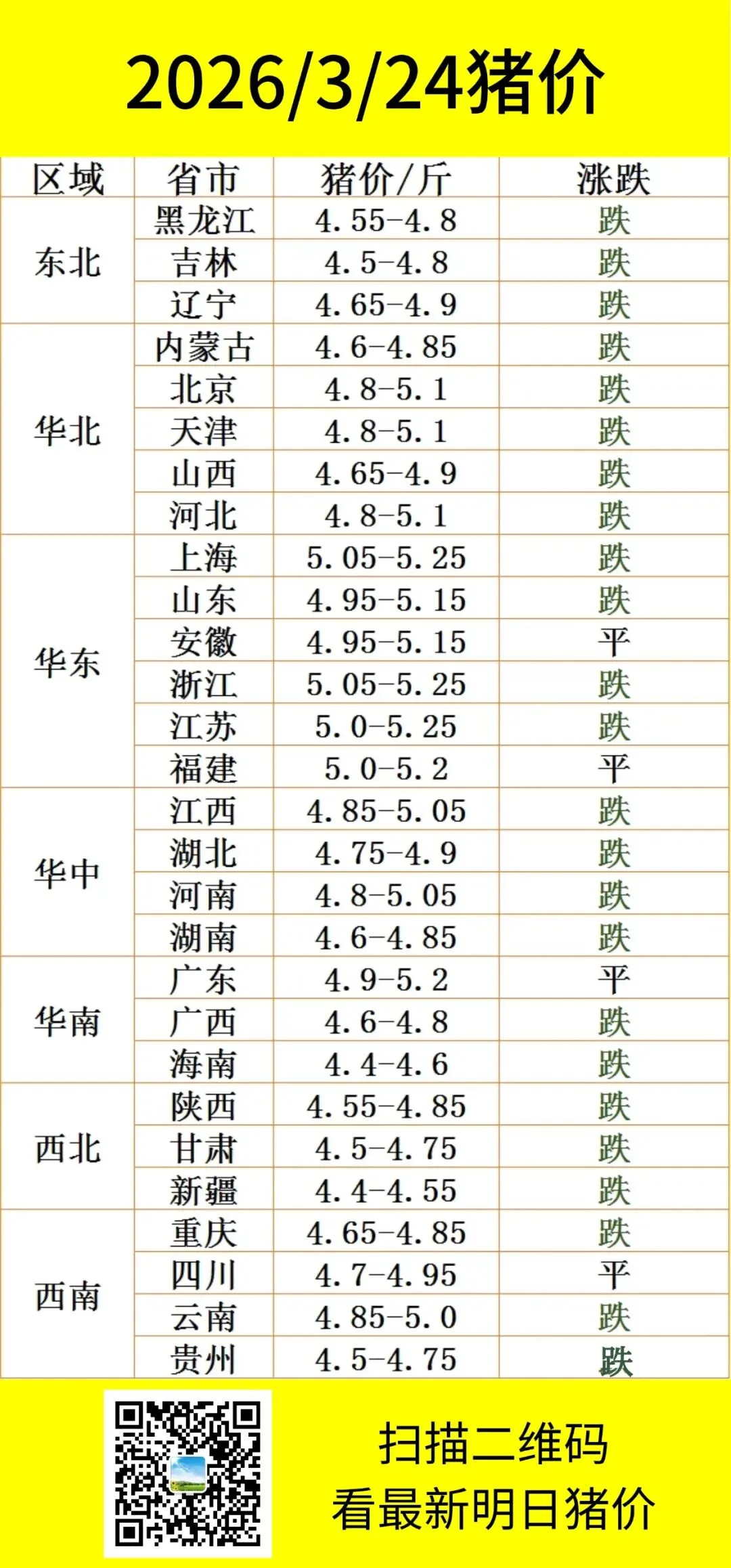 2026.3月24-明天猪价参考!(广东54.9-5.2元/斤!继续下跌!)
