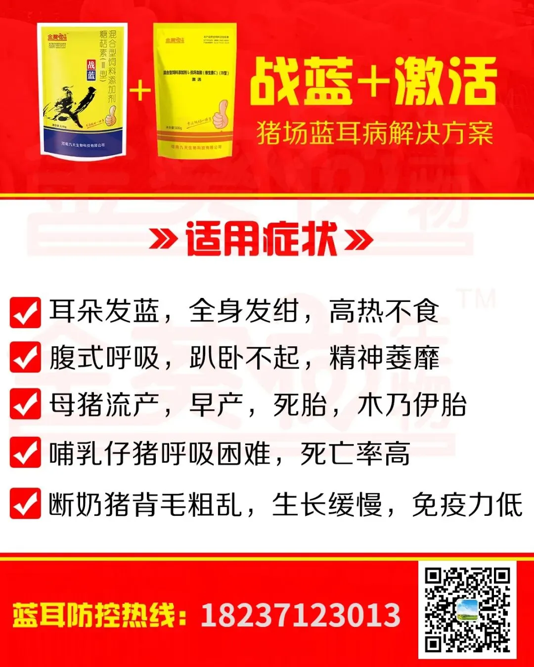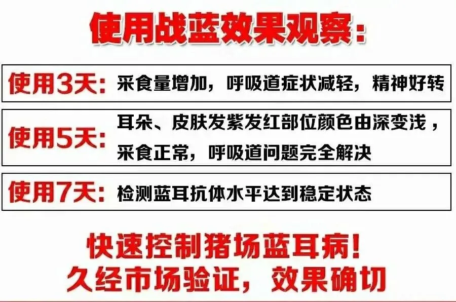 使用方法:1套预防拌料1000斤,治疗拌料500斤,连用7天。使用战蓝3-5天咳嗽喘气明显好转,7天控制病情。可治疗可净化预防,抗病毒,安全无药残,猪群更稳定。