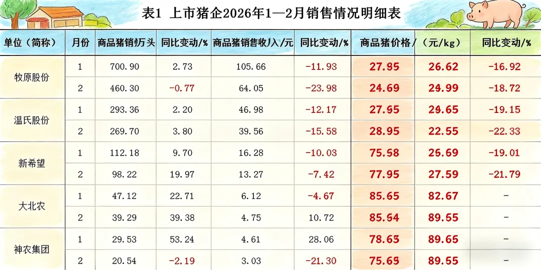 售价大幅跳水:与去年同期相比,商品猪的销售均价跌幅普遍在16%至22%之间。到了2月份,每公斤售价已滑落至11.2元至11.62元的区间,头部企业也不例外。