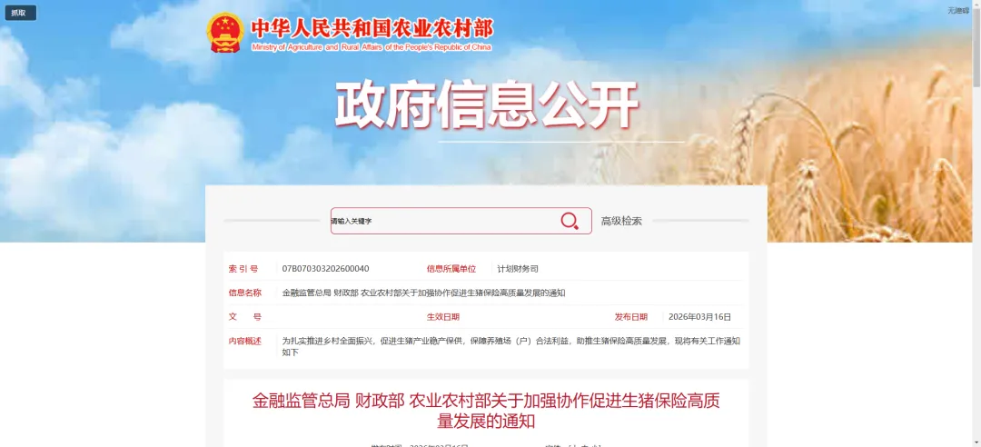 生猪保险迎来关键改革“加强生猪产能综合调控”已被写入“十五五”规划纲要,其重要性不言而喻。近期,金融监管总局、财政部、农业农村部联合发布了《关于加强协作促进生猪保险高质量发展的通知》,推动生猪保险从过去的“保死亡”向“保价格、保收入”转型。核心变化有三点:一是建立动态费率调整机制,让保费与风险挂钩;二是推动保险向全产业链延伸,未来养殖户可以通过购买价格险、收入险来锁定收益;三是强化数据共享,通过养殖、检疫、无害化处理等数据的交叉核验,让承保理赔更加精准,减少骗保风险。