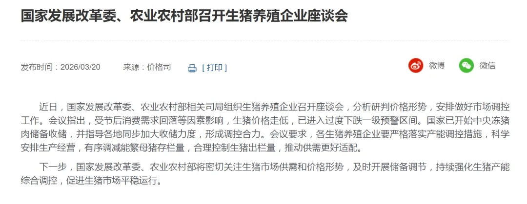 面对 “猪周期” 史上最惨烈下跌,国家层面迅速亮剑。3 月 20 日,国家发改委、农业农村部联合召开生猪养殖企业座谈会,释放三大重磅信号: