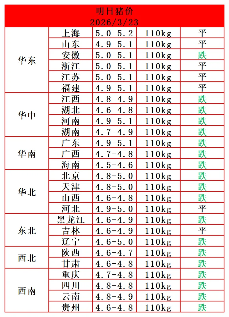猪价再跌!2026.03.23鼎王猪价播报早知道! 养羊网 2026-03-23 猪价再跌!2026.03.23鼎王猪价播报早知道!立马收到明天最新猪价鼎王金猪就是长得快!订购电话:13980400130 养羊网 2026-03-23 上一篇:重磅信号!猪价触 20 年新低,国家启动一级预警 下一篇:猪价低迷!胆汁酸从⑤个方面综合提升猪场效益 您可能还会对下面的文章感兴趣111: 相关文章 2026.1.8猪价早知道 明日(2月11日)鸡蛋价格预测 昆明鸡蛋价格参考:2月27日!无需求,产能过剩! 2025年4月13日全国各地生猪价格信息