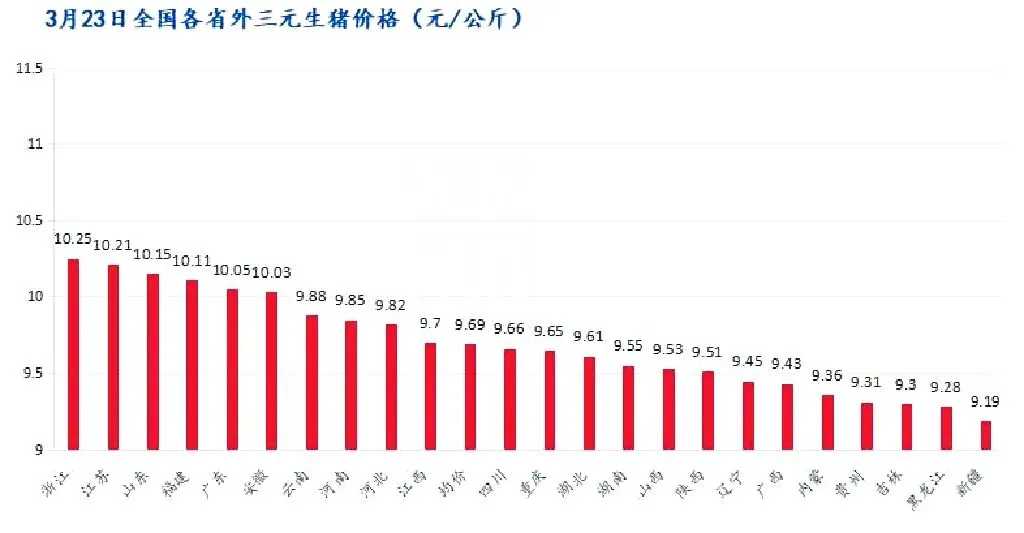 3月23日全国外三元生猪出栏均价为9.69元/公斤,较昨日下跌0.11元/公斤,最低价新疆9.19元/公斤,最高价浙江10.25元/公斤。