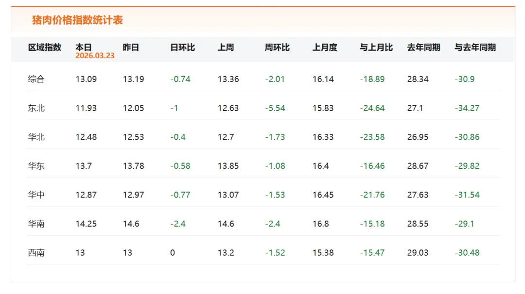 3月渐入下旬,自2026年以来,国内生猪市场,猪价呈现萎靡不振的局面!虽然,去年末,冬至前养殖端出栏节奏加快,部分产能有前置出栏现象,元月中上旬,供应压力减轻,且,肥猪价格走高,带动市场挺价惜售情绪,国内标猪报价短暂回升至13.16元/公斤!