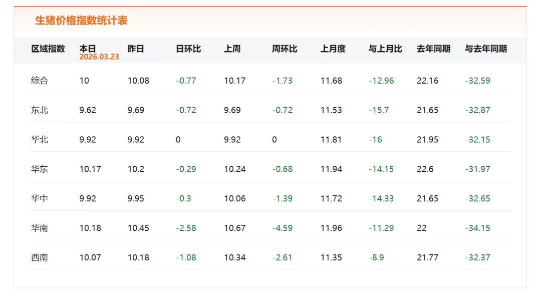 进入3月份,生猪供应压力进一步增加,而鲜品猪肉购销持续冷清,供需失衡局面下,猪价重心跌破10元/公斤,且,价格持续向下调整,截至目前,标猪报价跌至9.78元/公斤,猪价相比年初峰值下降近25%……