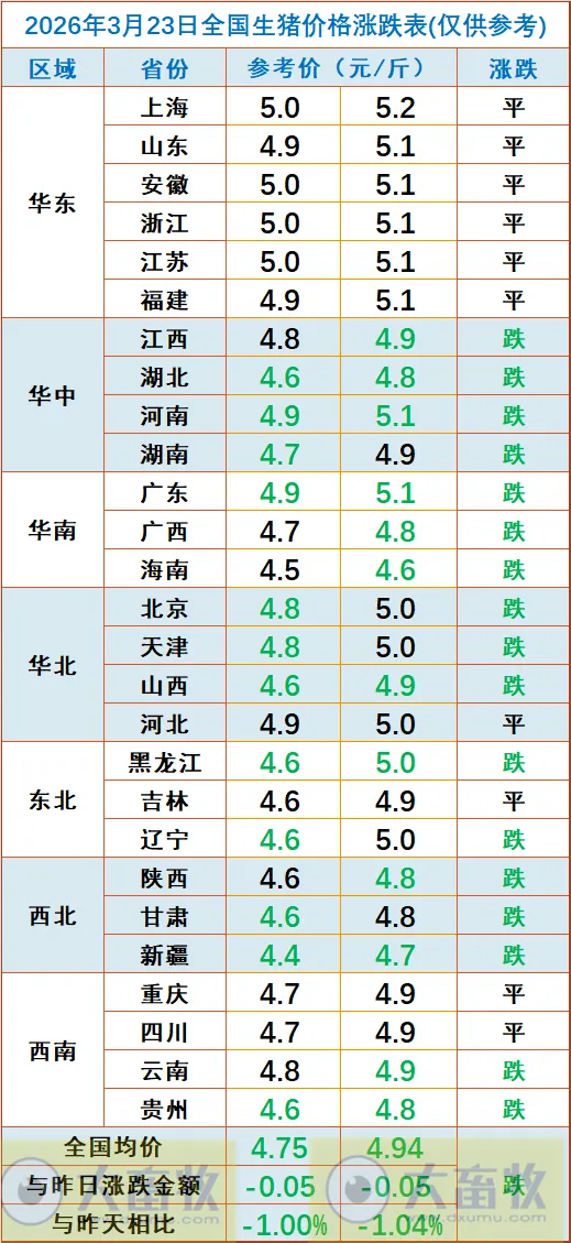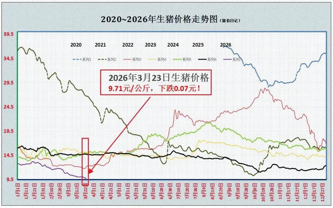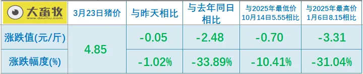 根据我国27省的猪价数据,计算出2026年3月23日全国平均猪价为每斤4.85元,比昨天下跌0.05元,跌幅为1.02%,跌幅扩大,连续4天下跌,累计下跌0.15元,不仅是今年以来最低,更是至少是2019年以来新低;