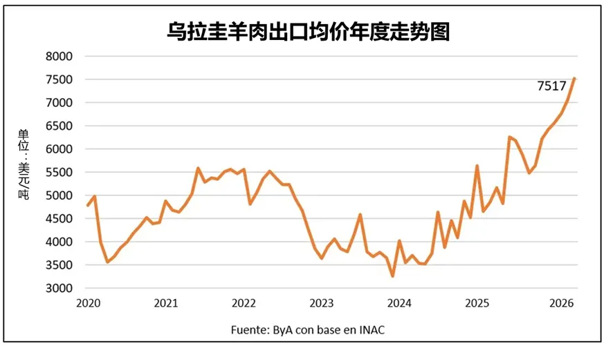 ? ? 过去一周,出栏羔羊及出口羊肉吨价双双刷新历史纪录。乌拉圭国家肉类协会截至14日的统计显示,过去八周出口羊肉价格持续上涨,累计涨幅达20%(每吨1300美元),过去30天均价达到每吨7517美元的历史新高,同比上涨54%(去年同期为每吨4888美元)。与此同时,羔羊价格继续飙升。