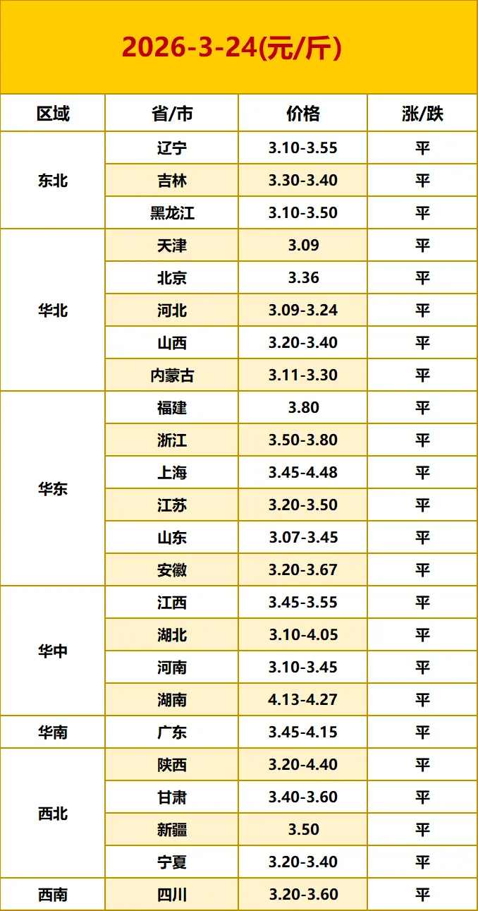 2026.3.24 今日鸡蛋价格 养羊网 2026-03-24 2026.3.24 今日鸡蛋价格蛋价日评:今日鸡蛋价格稳中偏强。清明备货需求带动走货有所加快,不过当前在产蛋鸡存栏充足,叠加饲料成本高位支撑,蛋价以小幅震荡上行走势为主,清明过后需求回落或面临小幅回调压力,整体缺乏大幅上涨动力。以上报价仅供参考! 养羊网 2026-03-24 上一篇:3月24日:贵州、广西、广东鸡蛋价格; 下一篇:【明日猪价】3月24日继续探底,猪价再创下地,多地猪价跌破4.5元/斤! 您可能还会对下面的文章感兴趣111: 相关文章 畜牧圈张博士vlog|2023年泰山论坛 2025年4月13日全国各地生猪价格信息 近期价格更新!!! 近期价格更新!!!