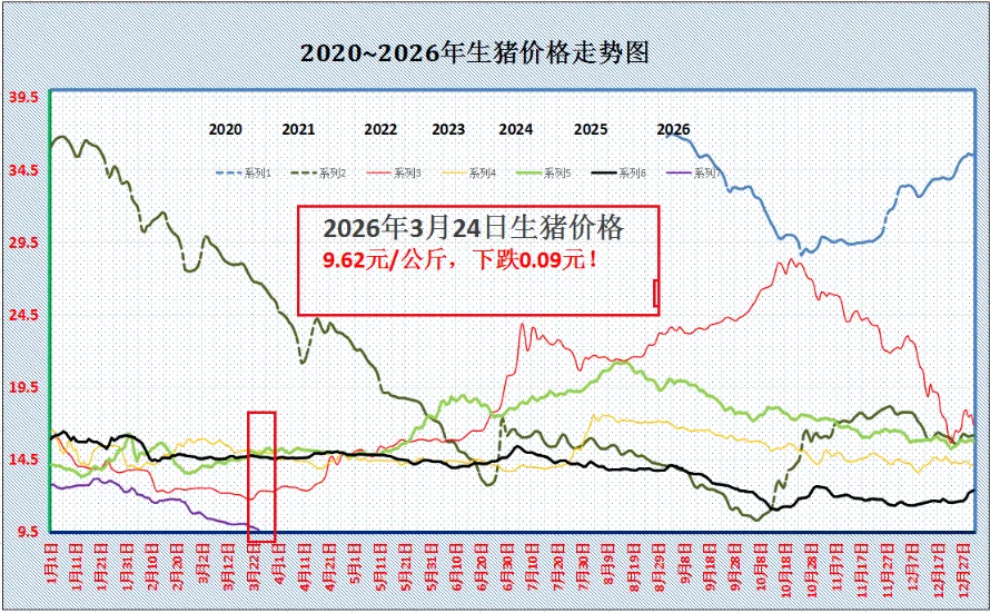 【明日猪价】3月24日继续探底,猪价再创下地,多地猪价跌破4.5元/斤!生猪均价继续下跌 近期生猪价格整体呈下跌走势,从春节后开始,猪价是低开低走,已经创下近20年的新低,还在继续探底。猪价下跌的同时,饲料价格还在上涨,养猪人的亏损持续扩大,从头部猪企到散养户,陷入全面的亏损。 明天生猪均价下跌0.09元/公斤,均价9.62元/公斤,合到4.81元/公斤。猪价近日连破5.0元/斤、4.9元/斤大关,现在又站到了4.8元/斤大关,按照这个下跌趋势,有跌破4.8元/斤的几率。 现在头部猪企由于多数是产业链的模式,之前卖仔猪一直还是赚钱的,又可以生产饲料等,抗压能力更大。而养猪散户比较灵活,春节前出栏后,现在低谷期可以暂时空栏。 那些中型的养猪企业就难了,养猪成本高,也不能轻易减少养殖量,养殖量少了,平均成本更高。在猪价继续下探,饲料继续上涨的情况下,或许是最先撑不住的。