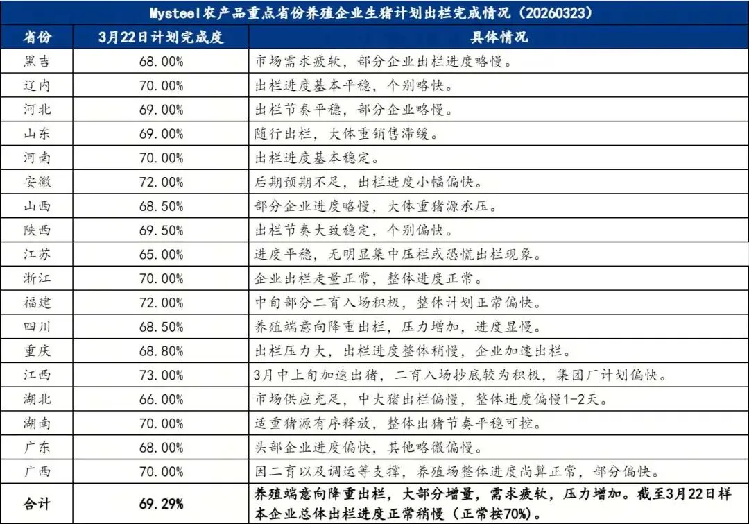 猪企出栏进度偏慢 截至3月22日,猪企出栏量平均完成69.29%,而根据3月份天数计算,应该完成70.96%才是正常进度。也就是说猪企出栏节奏还是慢了,未来几天需要加大出栏量,才能完成正常出栏计划。 按照以往的规律,月底月初猪企有缩量出栏拉价的预期,3月份猪企出栏偏慢,月底缩量的概率在降低。如果减少了出栏量,短时间减小了猪价压力,但出栏推迟,4月份的猪价会承受更大的压力。 每年的3-4月份,都是传统的猪肉消费淡季,在五一后猪价回暖。今年上半年养殖端出栏量都在阶段性的高位,猪价什么时候能够回暖还不明朗。
