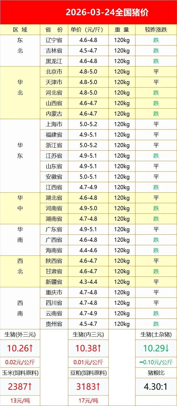山东慧丰源3月24日猪价行情 养羊网 2026-03-24 山东慧丰源3月24日猪价行情 养羊网 2026-03-24 上一篇:【养猪课堂】行情早报—03月24日全国猪价! 下一篇:今日猪价(2026.3.24) 您可能还会对下面的文章感兴趣111: 相关文章 怎样做兰州拉面:兰州拉面的做法详解 为什么羊没能成为人类的宠物? 第39篇:什么是【猪周期】? 【超前猪价】2月22日:猪价一夜大涨!180°大反转?猪价上涨“猛拐头”!