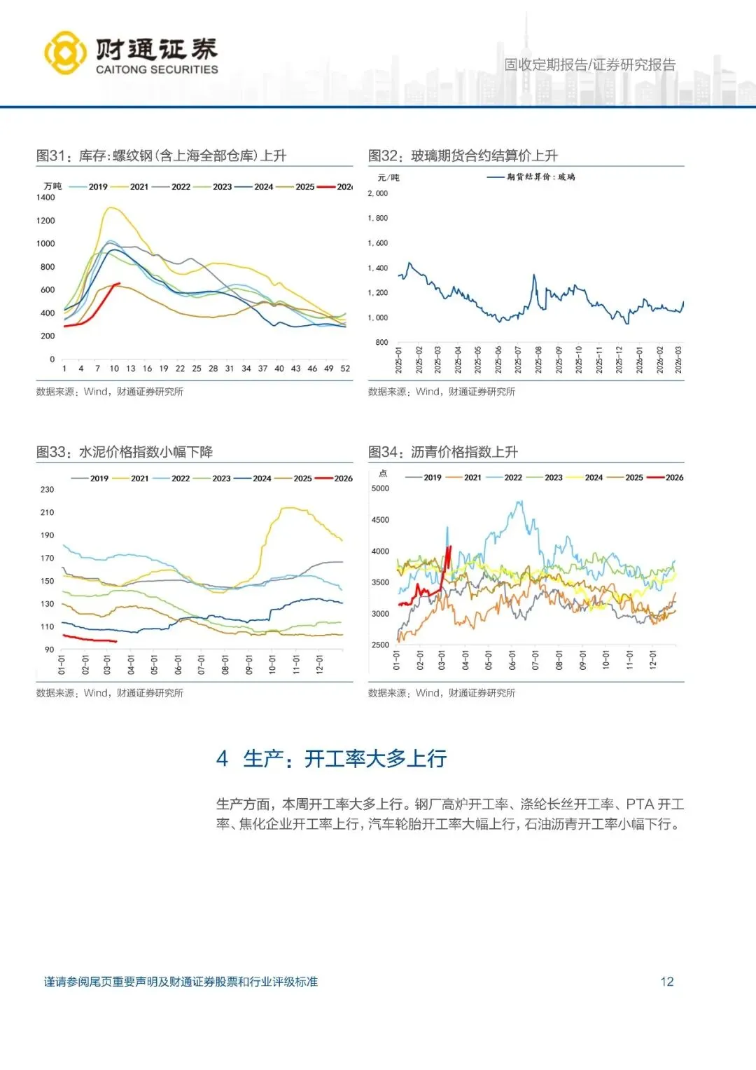 本周主要关注点:(1)节后第三周开复工率弱于去年,开复工率环比上升幅度也不及去年,结合样本量变化、春节假期靠后和高频价格,我们维持前期观点,今年春节后三周建筑行业开复工的实际情况或低于去年。(2)本周猪肉价格加速下跌。尽管从"能源-化工-农产品"链条来看,豆粕、玉米价格上涨会从成本端对肉价形成支撑,但我们判断,短期内生猪仍有下不行空间。供给端,目前存栏和出栏均重仍处于高位,由于饲料价格上涨,亏损严重的企业会加速出栏;需求端,正值淡季,消费需求增长乏力。(3)3月6日-12日,20城新房、北上深杭二手房成交面积同比均明显下降,表明目前地产销售表现疲软。