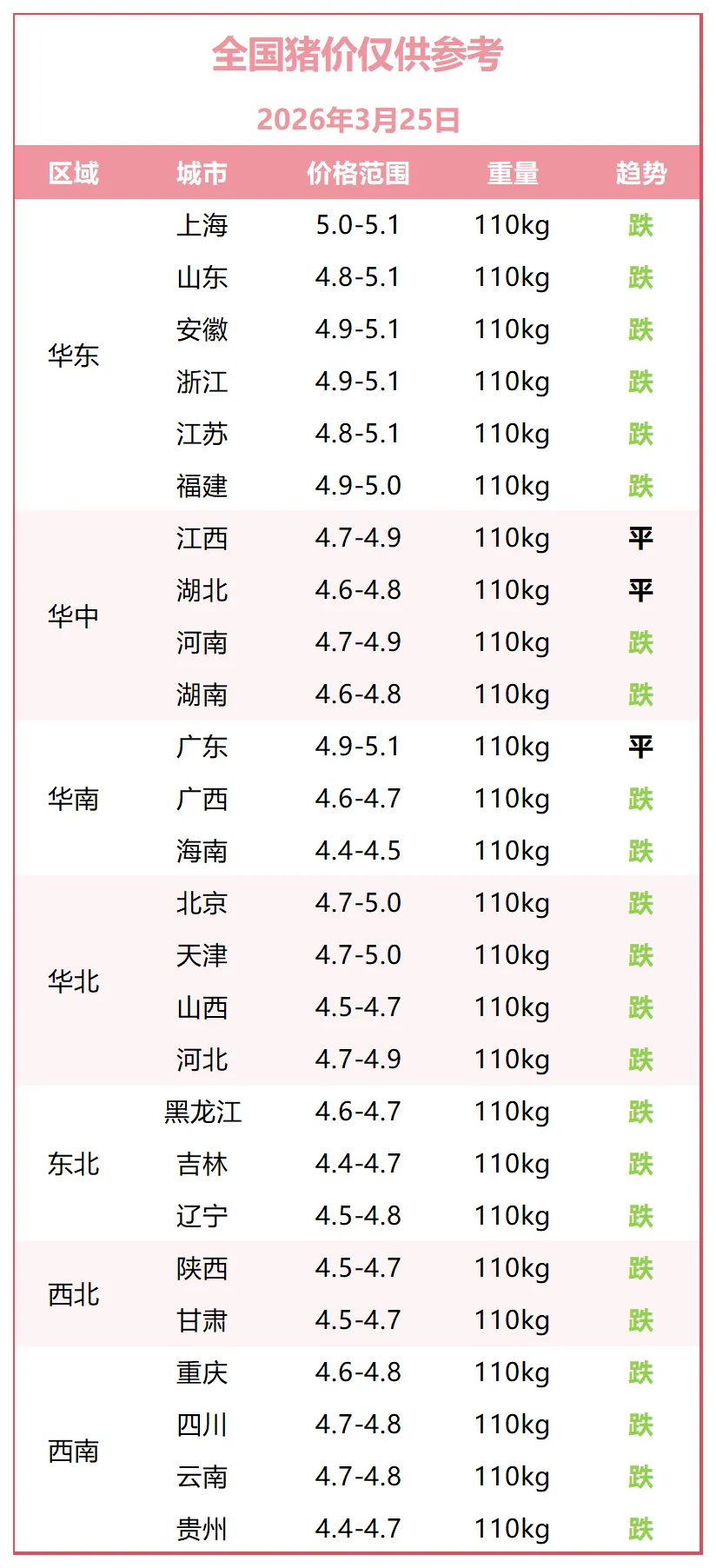 明日猪价早知道~全国地区猪价下跌,仅有3个地区的猪价是持平! 养羊网 2026-03-24 明日猪价早知道~全国地区猪价下跌,仅有3个地区的猪价是持平!猪价播报2026年3月25日全国猪价播报全国猪价播报~END~长按识别二维码关注我们 养羊网 2026-03-24 上一篇:《湖北荆门》褐壳鸡蛋价格2026年3月23日 下一篇:【猪价预测】3月26日至3月28日!全国猪价! 您可能还会对下面的文章感兴趣111: 相关文章 圆通快递 小红书签到 极度社恐、第一次在菜市场买肉。 谁给鸡蛋蛋黄房开的这么大的?