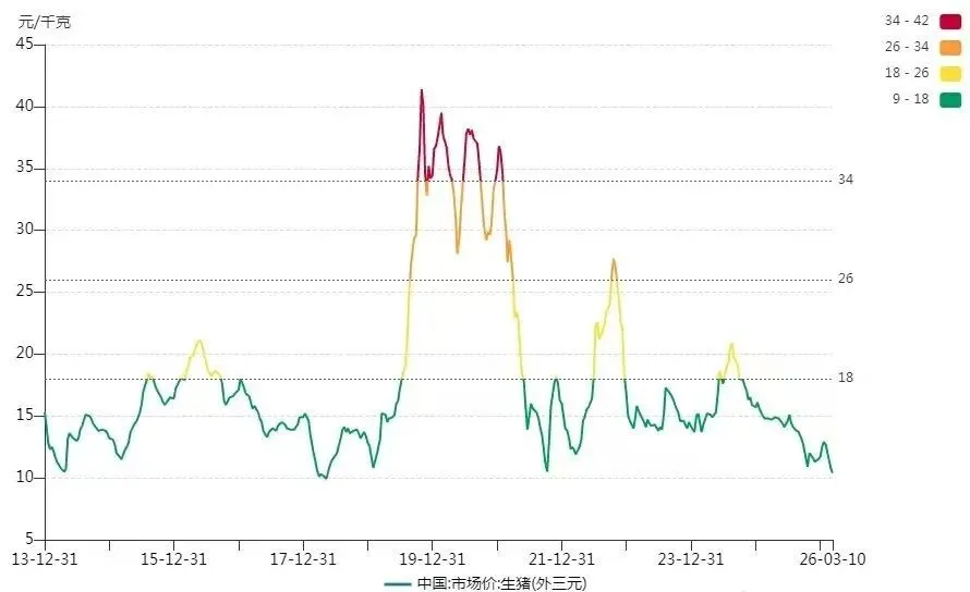 中国养猪网监测数据显示,截至3月21日,全国外三元生猪出栏均价已然跌至10.22元/公斤,即将跌破10元/公斤的心理支撑价位。而这个价格,距离2018年的历史大底——9.92元/公斤,只差3毛钱。