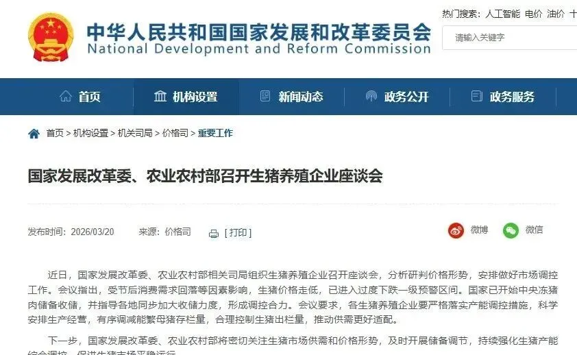 国家发展改革委、农业农村部将密切关注生猪市场供需和价格形势,及时开展储备调节,持续强化生猪产能综合调控,促进生猪市场平稳运行。