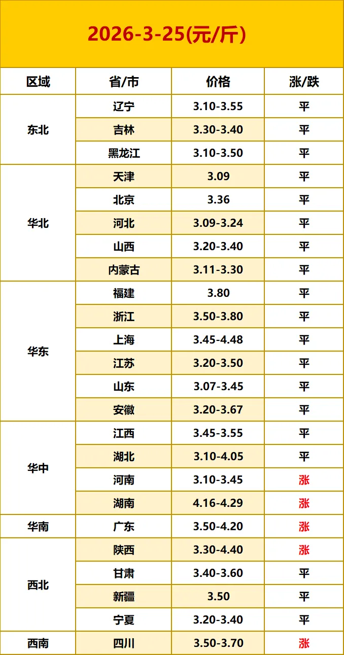 2026.3.25 今日鸡蛋价格 养羊网 2026-03-24 2026.3.25 今日鸡蛋价格蛋价日评:今日鸡蛋价格稳中偏强。清明备货需求带动走货有所加快,不过当前在产蛋鸡存栏充足,叠加饲料成本高位支撑,蛋价以小幅震荡上行走势为主,清明过后需求回落或面临小幅回调压力,整体缺乏大幅上涨动力。以上报价仅供参考! 养羊网 2026-03-24 上一篇:【明日 猪价】 3月26日~3月29日!全国猪价!!!?!!! 下一篇:【明日猪价】跌猛了,3月25日猪价大范围下跌,继续探底! 您可能还会对下面的文章感兴趣111: 相关文章 河马生鲜的雪蟹!冲冲冲 2025年4月13日全国各地生猪价格信息 2025年4月13日全国各地生猪价格信息 挑战薅羊毛一年攒1w第2??4??天