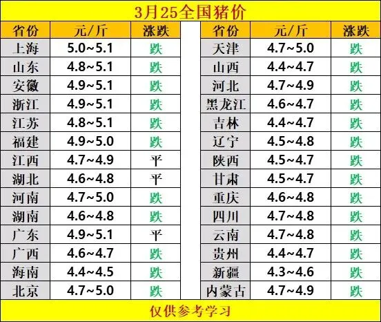 2026.3.25——明日猪价预测 养羊网 2026-03-24 2026.3.25——明日猪价预测 养羊网 2026-03-24 上一篇:养猪客|2026.3.25|明天猪价分析(只供参考) 下一篇:3月24日全国猪价继续下跌【动力猪价】 您可能还会对下面的文章感兴趣111: 相关文章 智能养羊黑科技,牧场增收3倍省力70% 2026.3.3猪价快讯--福州穗丰动保 【猪小二】2.27日全国猪价预报:稳定为主 80元事件