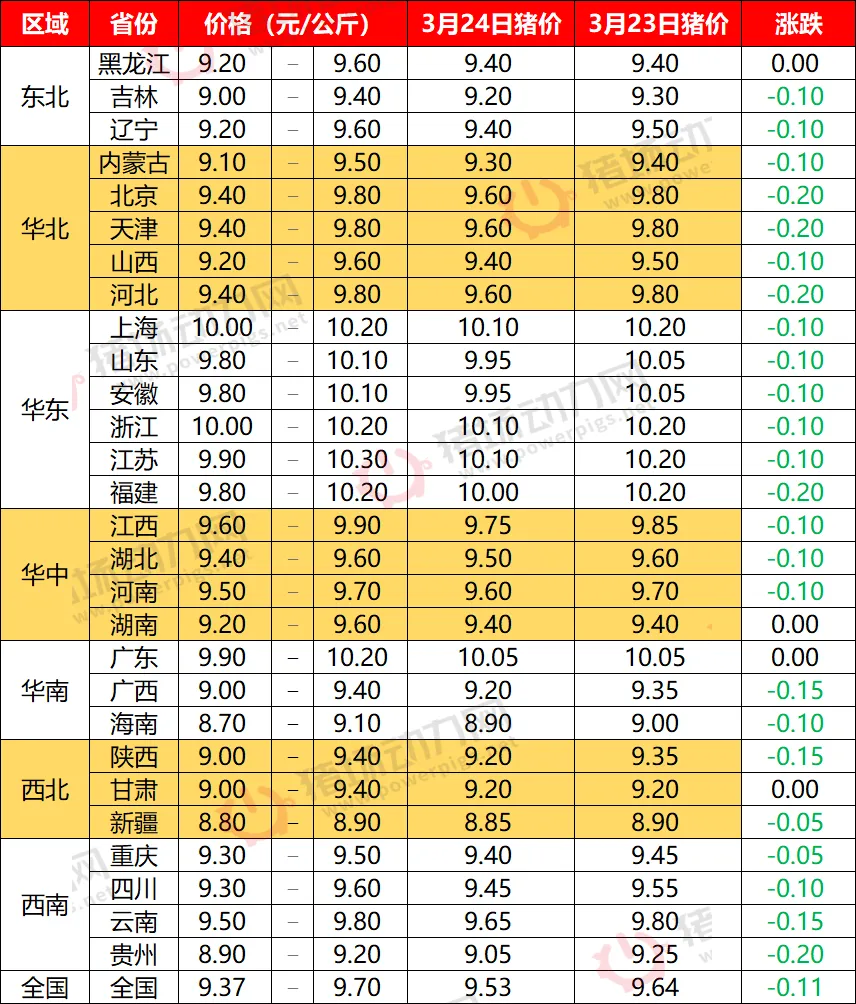 3月24日全国猪价继续下跌【动力猪价】