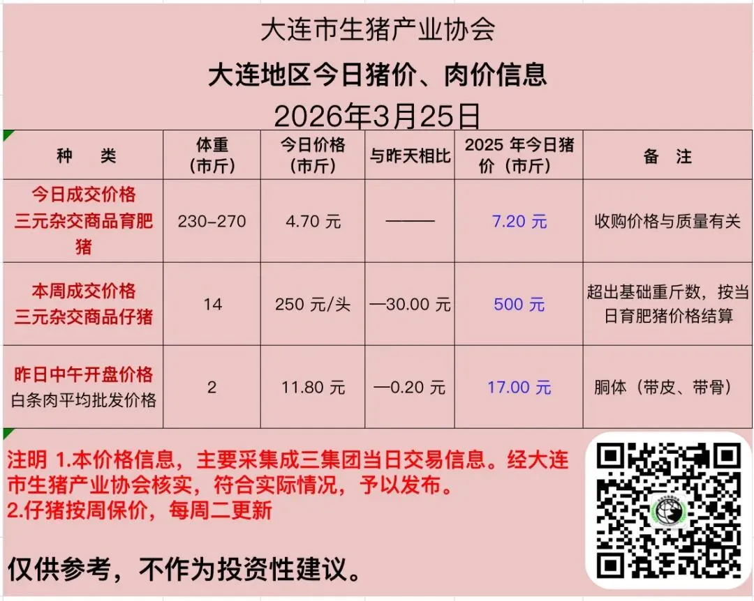 2026 年 3 月 25 日猪价、肉价信息 养羊网 2026-03-25 2026 年 3 月 25 日猪价、肉价信息天天报价大连市生猪产业协会 养羊网 2026-03-25 上一篇:3月25日最新猪价!!大面积飘绿,持续下跌!!! 下一篇:(3月25日)鸡蛋价格最新报价 您可能还会对下面的文章感兴趣111: 相关文章 2026年2月11日大鸿门猪价:稳中震荡 从高位到谷底,猪价再演大跳水 2026.2.28-全国猪价(短期猪价或有上涨,适时出栏) 小羊蹦蹦的生活照