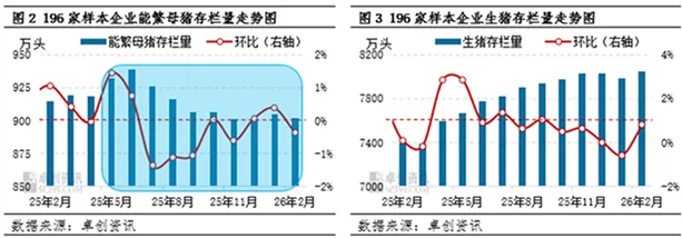 卓创资讯监测的196家中大型样本企业数据显示,2025年能繁母猪存栏量呈现“先增后减再盘整”的走势:2025年5-6月能繁母猪存栏量增加,7-9月回落,此后跌势暂止。按照生猪生产周期推算,2026年3-12月生猪理论出栏量,对应的是2025年5月至2026年2月的能繁母猪存栏量。这意味着,3-4月生猪理论出栏量仍在增加,5-7月将有所减少,此后主线稳定。