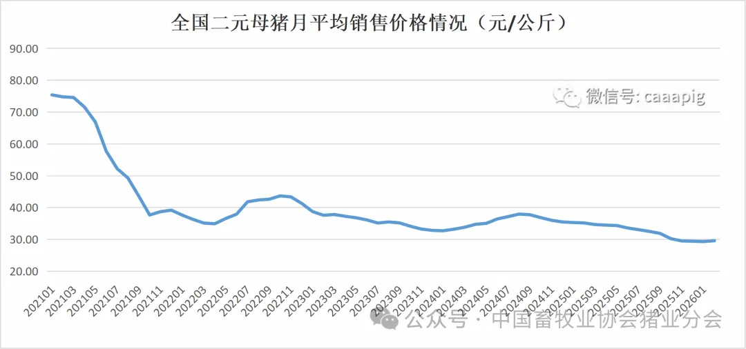 1、2026年2月份全国二元母猪销售价格29.59元/公斤,环比上涨0.9%,同比下跌15.9%。