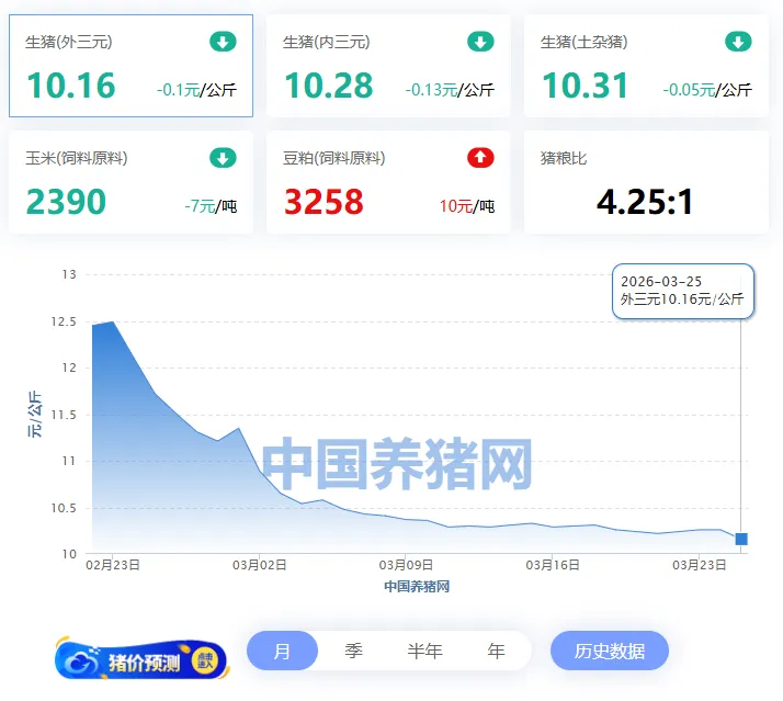 猪价系统 往期回顾 ? ??2026年3月24日猪价分析:外三元平稳 玉米豆粕小幅上涨 ? ??2026年3月23日猪价分析:整体小幅回升 区域分化明显 ? ??03月22日猪价:横盘低位震荡,行情进入“磨底”阶段