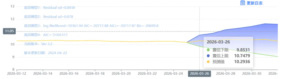 玄田算法是由项目课题组团队原创的非经典逻辑数值聚合理论和不确定性预测方法,构建了基于一致模算子的生猪价格预测模型。该模型采用的聚合函数及一致模相关理论与方法已获得多项国家自然科学基金和省级自然科学资金资助,并获得多项省级自然科学奖奖项。03月26日预测猪价为10.2936,置信区间在9.8531--10.7479之间。03月27日预测猪价为10.2550;03月28日预测猪价为10.3970。