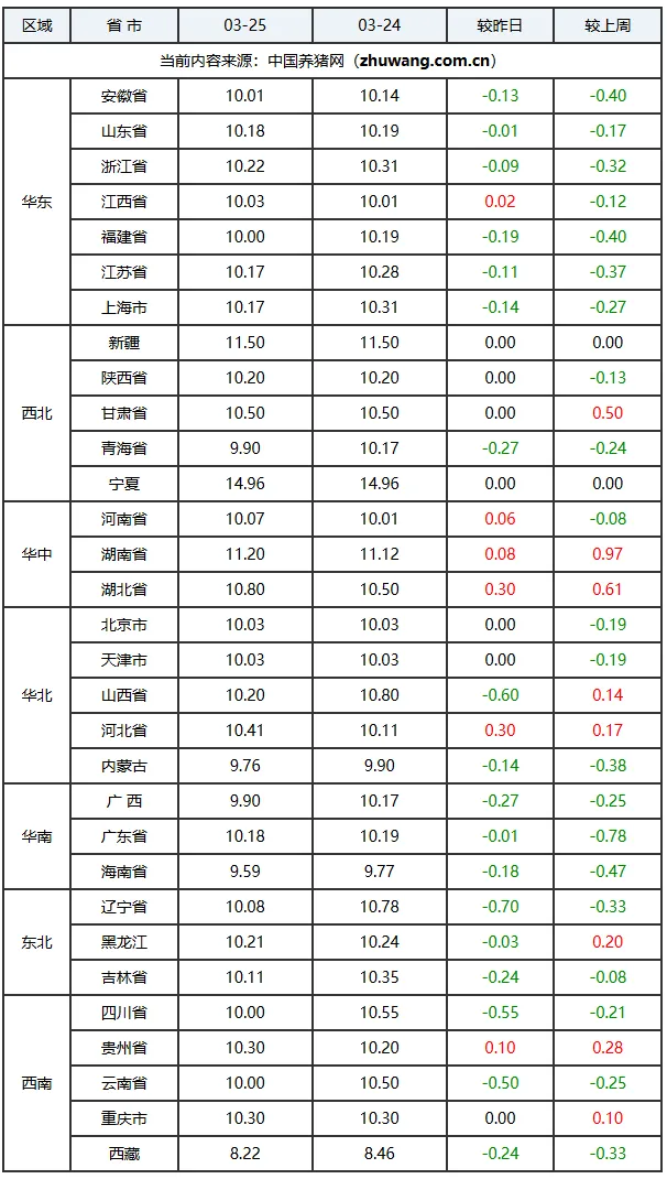 猪价上涨地区(6个):江西省、河南省、湖南省、湖北省、河北省、贵州省;上涨区间:0.02-0.30元/公斤; 猪价持平地区(7个):新疆维吾尔自治区、陕西省、甘肃省、宁夏回族自治区、北京市、天津市、重庆市; 猪价下跌地区(18个):山东省、福建省、江苏省、广东省、上海市、山西省、内蒙古自治区、安徽省、辽宁省、黑龙江省、四川省、广西壮族自治区、西藏自治区、吉林省、海南省、浙江省、青海省、云南省;下跌区间:0.01-0.70元/公斤; 2026年03月26日-中国养猪网 玄田算法预测明日猪价