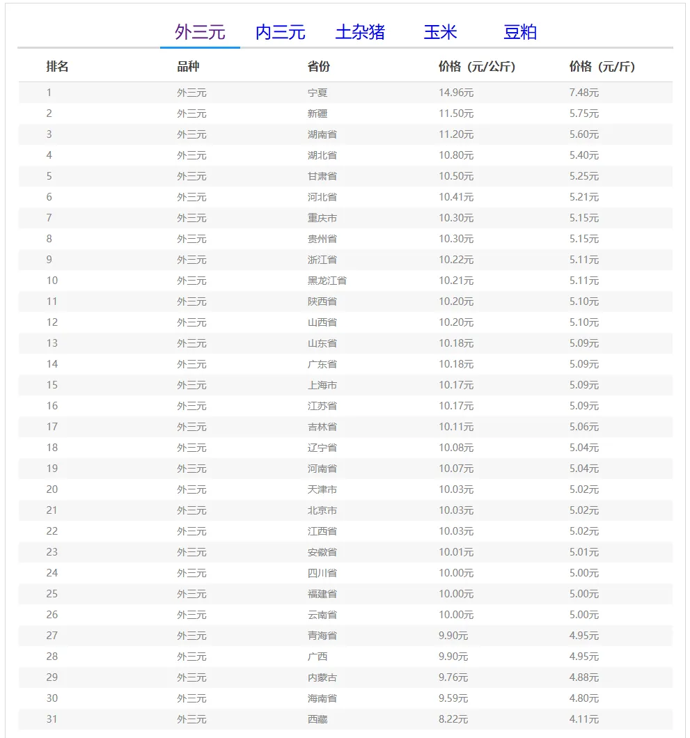 外三元排行后三:西藏自治区8.22元/公斤、海南省9.59元/公斤、内蒙古自治区9.76元/公斤;