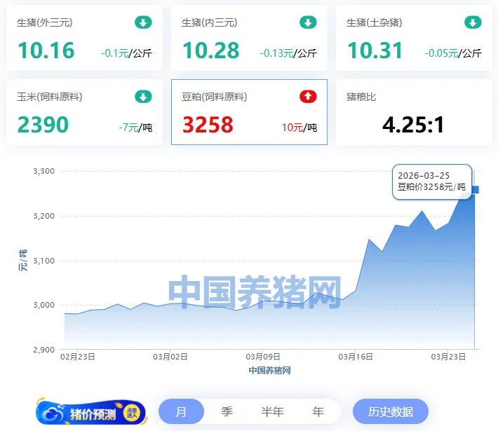 2026年03月25日-中国养猪网 全国豆粕价格走势图及涨跌表