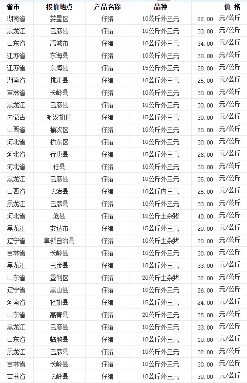 地区名称 | 外三元(元/Kg) | 内三元(元/Kg) | 土杂猪(元/Kg) |