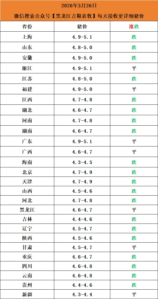 【黑龙江吉粮农牧】2026年3月26日猪价早知道点击上方"蓝字" 关注我们吧!